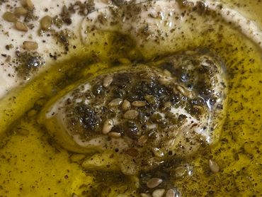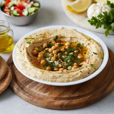 Hummus is a popular Middle Eastern dish made from blended chickpeas, tahini (sesame paste), olive oil, lemon juice, garlic, and salt. Hummus is celebrated for its creamy texture, rich flavor, and nutritional benefits, being high in protein, fiber, and healthy fats.